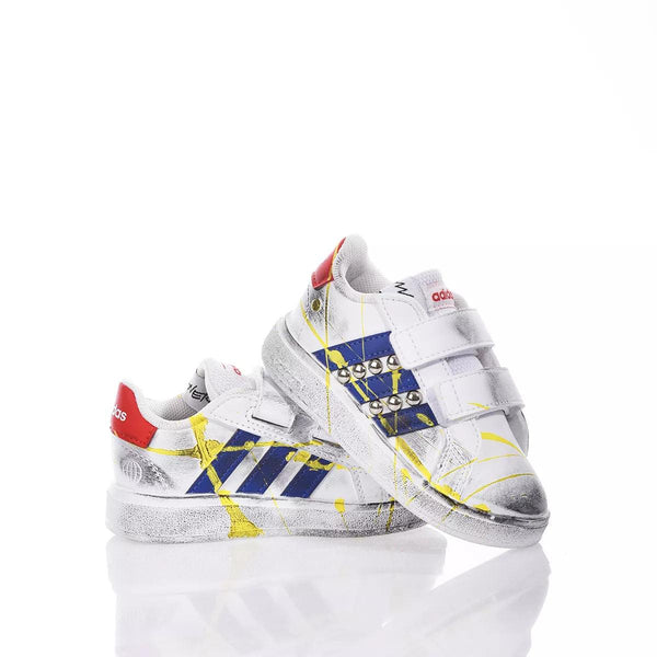 Adidas Baby Primary è la sneaker custom per i più piccoli, modello sprintoso con le classice tre "stripes" adidas blu elettrico e il talloncino rosso, sporcato ed invecchiato, schizzato di vernice gialla per comporre il trio di colori primari, rifinito con borchie argento per completare il look. Questa sneakers darà sicuramente una marcia in più anche ai più piccoli.