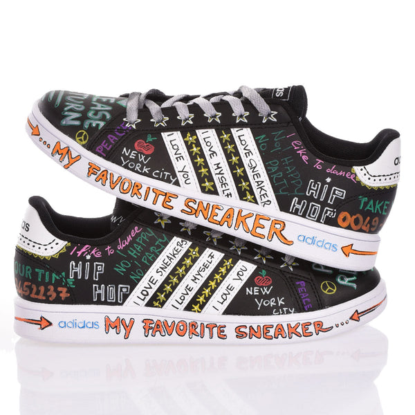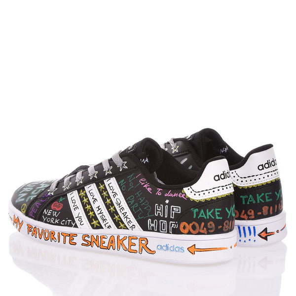 Adidas Black Board: Base nera con dettagli bianchi, completamente invasa da graffiti multicolor. I lacci delavati accendono il look con un tocco street deciso.