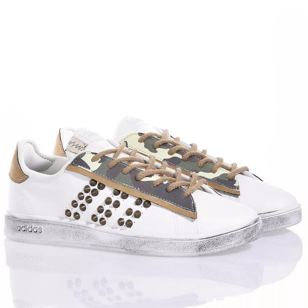 Adidas Camo Studs è la sneakers personalizzata da uomo, street e allo stesso tempo grintosa, il retro e il dettaglio sotto i passalacci in ecocamoscio color ice coffee, a dare la marcia in più però è sicuramente il passalacci in camouflage e le tre iconiche righe adidas in borchie effetto vintage. Completano il look street di questa scarpa la sporcatura sulla suola ed il laccio in corda marrone.
