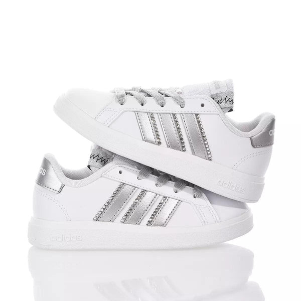 Adidas Junior Crystal è la sneaker custom da bambina, accanto alle tre righe argento come il retro sono stati applicati degli strass brillanti con le stesse tonalità per creare un abbinamento perfetto e unico ultimato poi dal laccio laminato sempre argento.