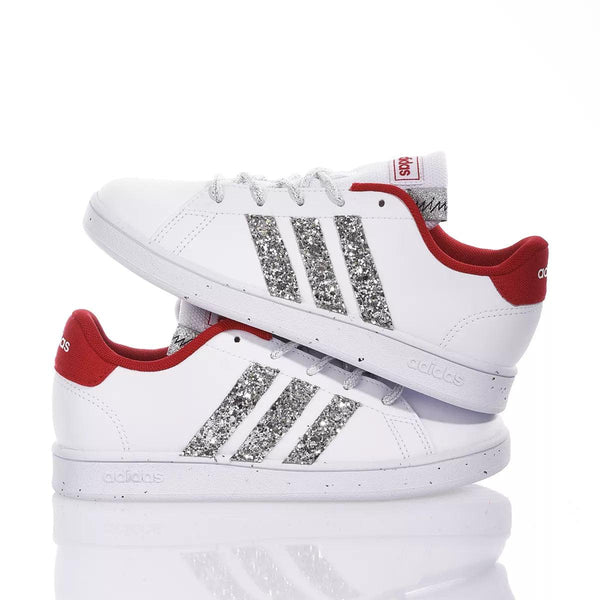 Adidas Junior Red & Silver è la sneaker custom per i più piccoli, la base con i tocchi di rosso acceso nella parte interna e nel tallone viene arricchita dal glitter argento sulle classiche tre bande adidas, lo stesso glitter richiamato anche dai lacci laminati.