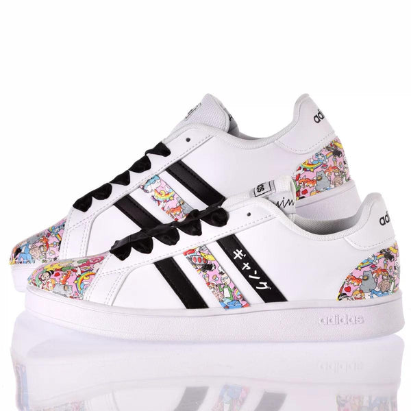 Adidas LaSabri Pika Gang con patch disegnato da LaSabri e Pika, che viene inserito sulla punta, nel retro e in una riga del logo Adidas. Ti verrà fornita con lacci neri in raso, oltre ai suoi originali bianchi. Disponibili per adulti e junior.