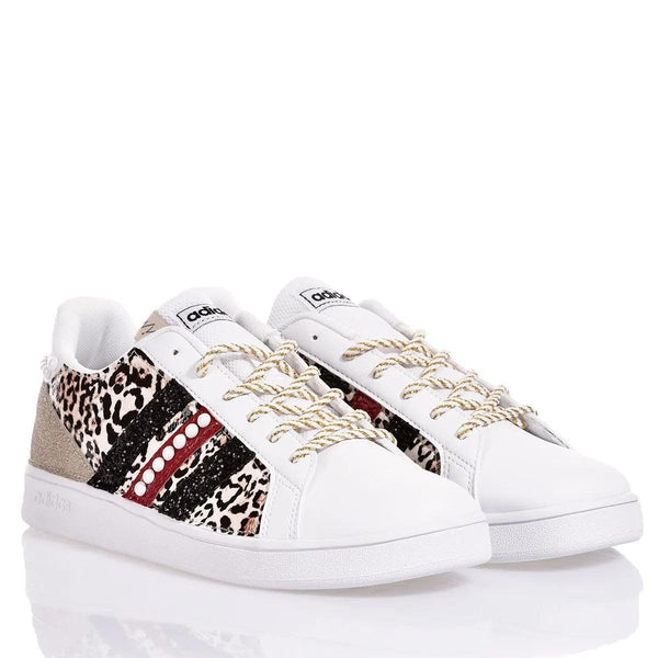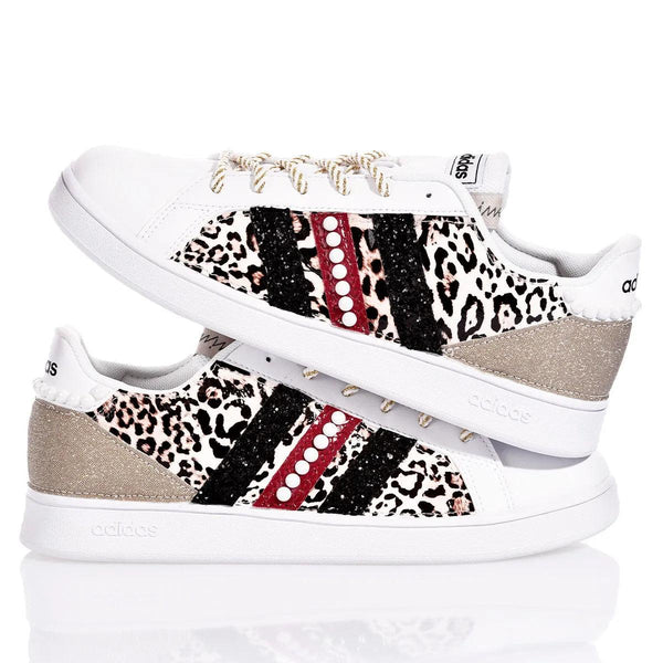 Adidas Leo Party sono la sneakers custom da donna perfette per chi vuole brillare con stile! La tomaia in ecopelle leopardata è impreziosita da glitter piatto oro. Le righe in glitter nero, interrotte dall'ecopitone rosso centrale e una fila di perle, aggiungono un tocco di eleganza e raffinatezza. Il dettaglio in perle sul retro esalta ulteriormente il design, mentre i lacci torchon bianco e oro completano il look con un tocco brillante e originale. Queste sneakers custom sono ideali per chi cerca un modello unico e audace.