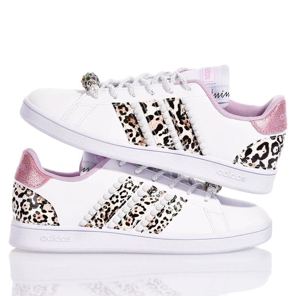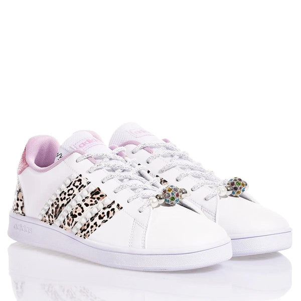 Le Adidas Leo Pearls sono le sneakers custom da donna che fonde grinta e raffinatezza. Il retro e le iconiche righe Adidas sono rivestiti in ecopelle leopardata, con le righe alternate da file di perle che aggiungono un tocco prezioso. I lacci in lurex argento e bianco completano il design, mentre la sfera gioiello sul fondo dell'allacciatura dona ulteriore eleganza. Sono le sneakers perfette per chi cerca uno stile audace e sofisticato.