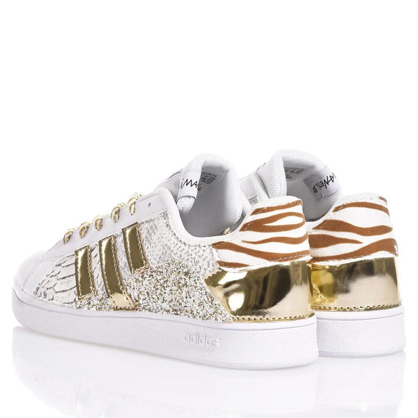 Le Adidas Light Mix sono le sneakers custom da donna che mixano eleganza e brillantezza. La tomaia in ecopitone bianco è arricchita da dettagli in glitter speciale bicolor bianco e light gold, che catturano la luce con ogni passo. Il tallone e le righe, rivestiti in ecopitone specchiato oro, donano un tocco di lusso che si fonde perfettamente con il retro in suede zebrata bianca e caramello, creando un contrasto sofisticato. I lacci torchon bianco e oro completano il look con un dettaglio elegante. Queste sneakers custom sono ideali per chi cerca uno stile raffinato, moderno e luminoso, perfetto per ogni occasione casual.