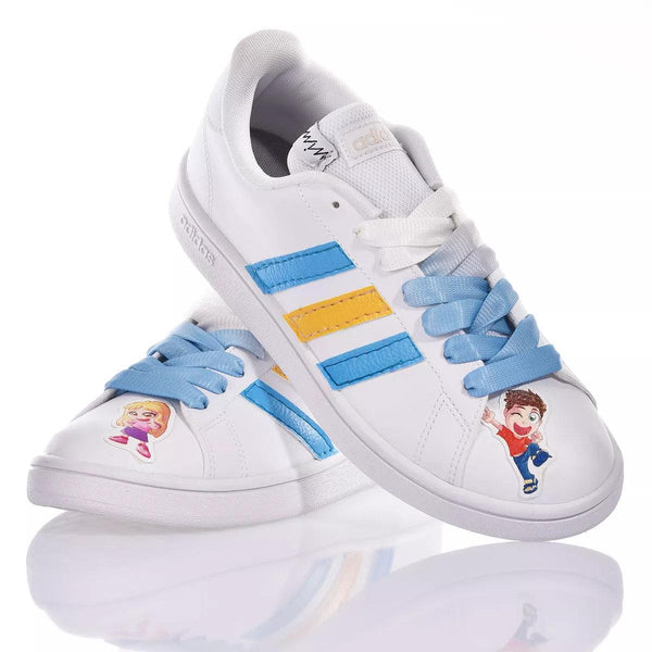 Adidas Ninna e Matti con patch di Ninna e Matti sulla punta delle scarpe, sulla scarpa destra laccio giallo, sulla scarpa sinistra laccio azzurro, righe del logo Adidas gialle e azzurre. Disponibili per adulti, junior e baby.