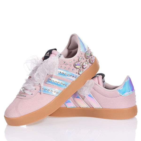 Le Adidas Pink Gem esprimono femminilità e raffinatezza grazie alla delicata tonalità rosa, impreziosita da pietre gioiello e cristalli Swarovski. A completare il design, i lacci in organza bianca donano un tocco etereo e sofisticato. Adidas Pink Gem verrà fornita con anche i suoi lacci originali.