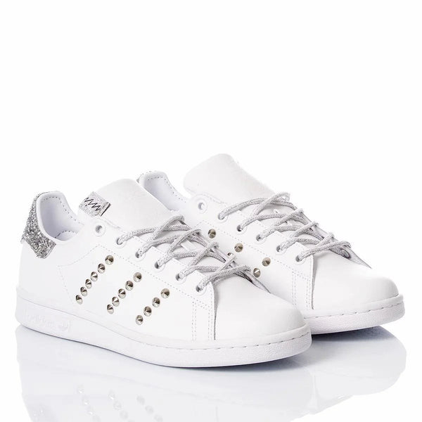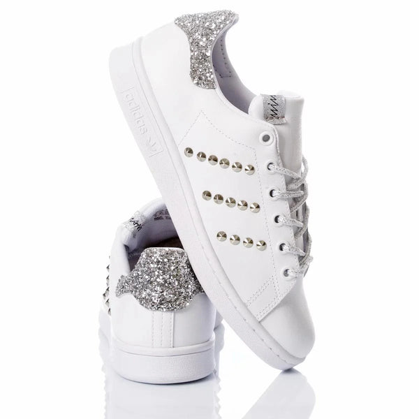 Adidas Stan Smith Silvery, la classica total white di adidas rivestita di un look nuovo: retro super brillante con applicazione di glitter argento, le tre righe laterali accentuale da file di borchie argento. Questa sneakers da donna si fa notare e sa luccicare a dovere. Adidas Stan Smith Silvery ti verrà fornita con lacci laminati argento oltre ai suoi originali bianchi.
