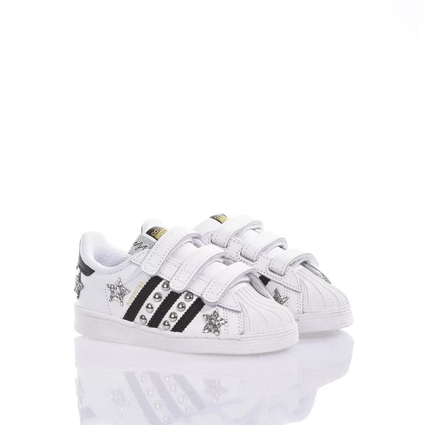 Adidas Superstar Baby Fix, glitter argento e stelle, ecco come nasce questa Adidas ogni stella viene tagliata e cucita a mano sulla scarpa, per poi applicare tra le righe due file di borchie argento e piatte. Questa sneakers da bambina sprigionerà una luce pazzesca sui tuoi piedi e catturerà gli occhi di tutti. Per permetterti un perfetto stile matchy-matchy mamma e figlia ecco qua la versione adulta. Adidas Superstar Baby Fix ti verrà fornita con gli strappi al posto dei lacci.