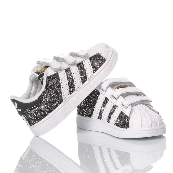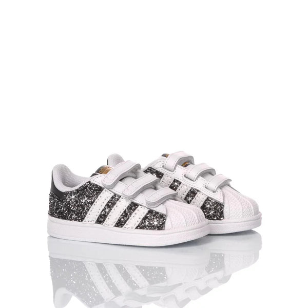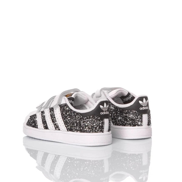 Adidas Superstar Baby Glitter Black, con il glitter non si sbaglia mai. Lati ricoperti di glitter nero e righe in glitter bianco, semplice ma d'effetto. Questa sneakers da bimba ha le idee molto chiare: brillare.