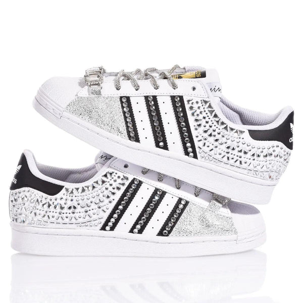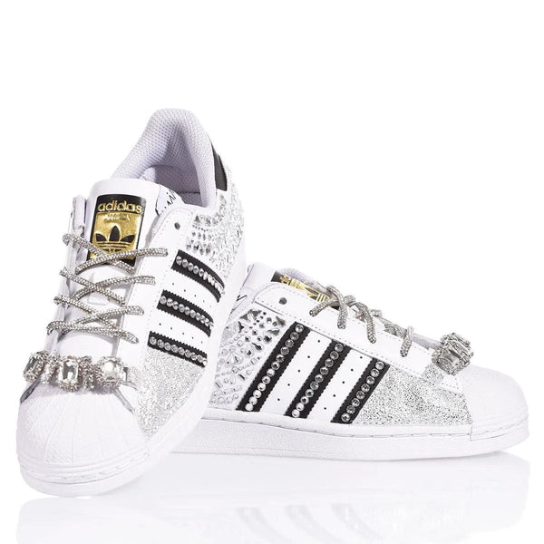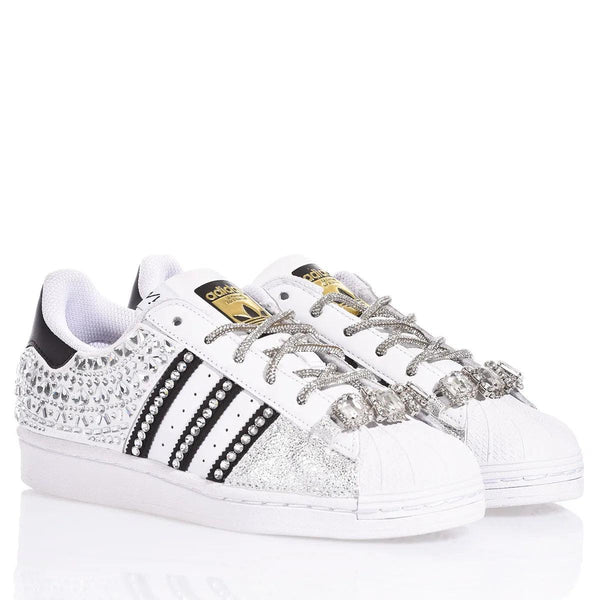 Adidas Superstar Chandelier sono le sneakers custom da donna che trasforma l'iconico design in un'opera di lusso scintillante. Motivo laterale esterno creato da preziose pietre, per un effetto unico e raffinato. Dettaglio laterale e lato interno in ecopelle cracklè colore argento aggiungono una nota metallica e sofisticata, mentre le tre righe Adidas sono impreziosite da file di Swarovski che catturano la luce con ogni passo. Il gioiello sul fondo dell'allacciatura e i lacci Swarovski completano il look con un tocco brillante e lussuoso. Un paio di sneakers pensato per chi cerca eleganza e originalità.