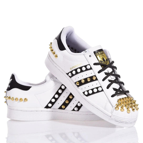 Le Adidas Superstar Studs Mix sono un incontro perfetto tra audacia e stile iconico. Il mix di borchie oro e bianche, su punta, righe e retro, donano un effetto grintoso e contemporaneo. Il laccio tondo nero completa il look con un tocco di semplicità, equilibrando l'effetto deciso delle borchie. Perfette per chi cerca una sneakers custom che unisca l'iconico design Adidas a un'impronta di originalità e forza, senza rinunciare alla versatilità.