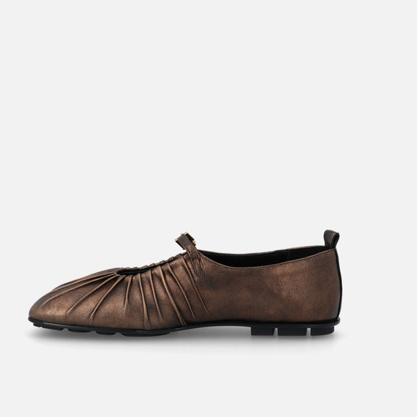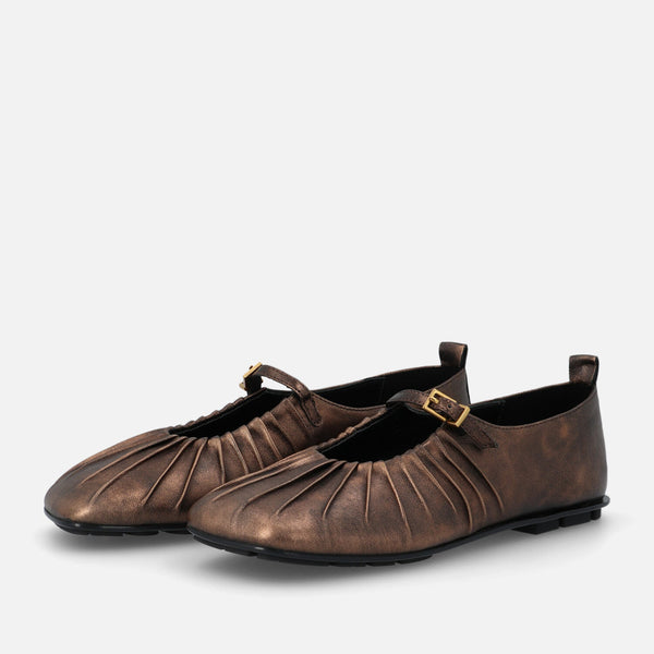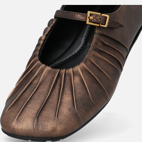 Baer Aveo è una ballerina a punta squadrata in pelle marmorizzata con effetto metal è un mix equilibrato di comfort, stile e ricercatezza. La tomaia è impreziosita da arricciature laterali, che creano un interessante gioco di volumi e texture. Il modello è completato da un cinturino sottile con micro fibbia dorata sul collo del piede e da una linguetta posteriore che ne facilita la calzata. La suola ultraflat in gomma con tasselli assicura praticità e grip. Un design originale e sofisticato, ideale per chi cerca una calzatura bassa con un tocco artistico e contemporaneo.