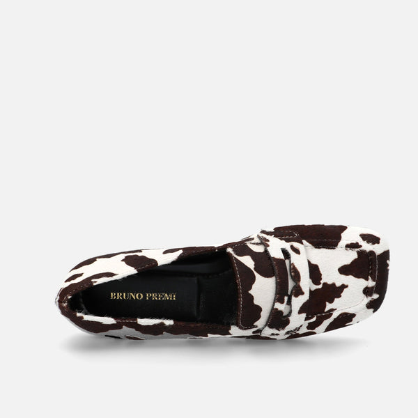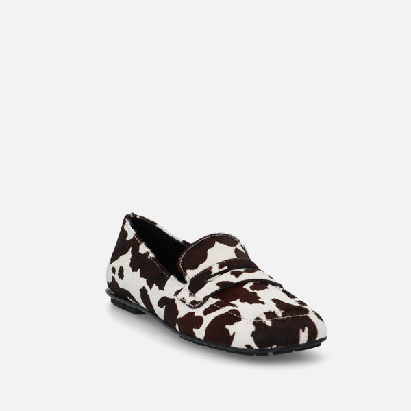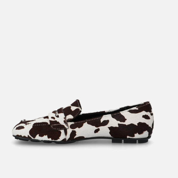 Il mocassino Baer Lof è realizzato in cavallino con stampa mucca e reinterpreta in maniera contemporanea il classico modello maschile del penny loafer. La tomaia in pelliccia effetto pony è decorata da una vivace stampa animalier black & white, che dona personalità e carattere deciso al design. La costruzione presenta una linea squadrata, con la tradizionale mascherina frontale tono su tono e una suola ultraflat in gomma con tasselli che assicura grip e comfort nella camminata. Un modello perfetto per chi vuole distinguersi con uno stile audace e giocoso, senza rinunciare alla comodità e all’eleganza casual.
