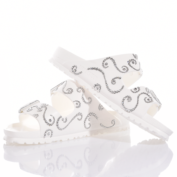 Birkenstock Arizona Athena: leggere, scintillanti e glamour! L'iconico modello Birkenstock completamente bianco e decorato con luminosi swarovski.