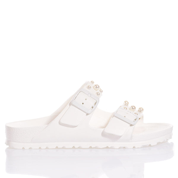Birkenstock Arizona White Pearls: La silhouette iconica di questo modello si rinnova con eleganza: base bianca essenziale e una cascata di perle mixate che donano luce e stile. Comfort inconfondibile, con un tocco raffinato perfetto per ogni occasione.