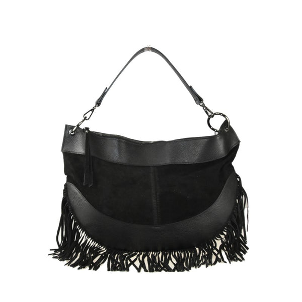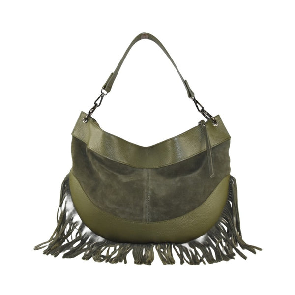 Borsa a spalla e tracolla donna in pelle con frange RH39843. Realizzata in morbida pelle Made in Italy, questa borsa combina stile boho e praticità. Il design è impreziosito da lunghe frange laterali che donano movimento e carattere, mentre la doppia portabilità – a spalla o a tracolla – la rende versatile per ogni occasione. L’interno è spazioso e organizzato con scomparti pratici per custodire al meglio gli oggetti personali. Disponibile in diverse varianti di colore, è un accessorio di tendenza che unisce eleganza e funzionalità.