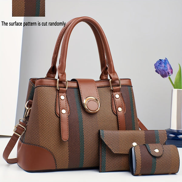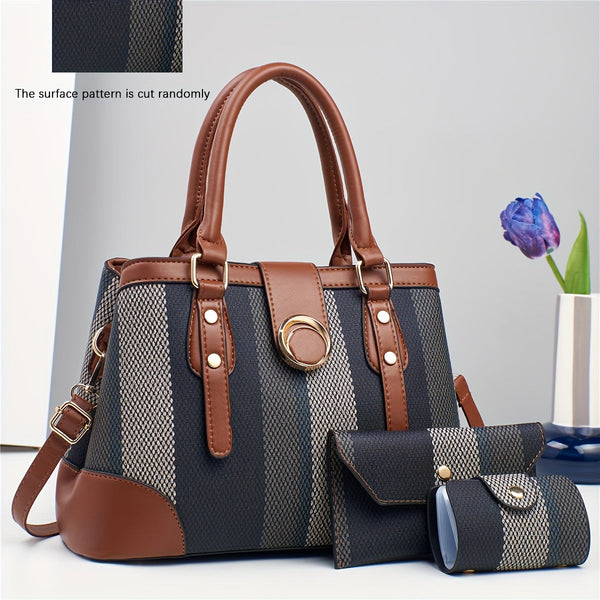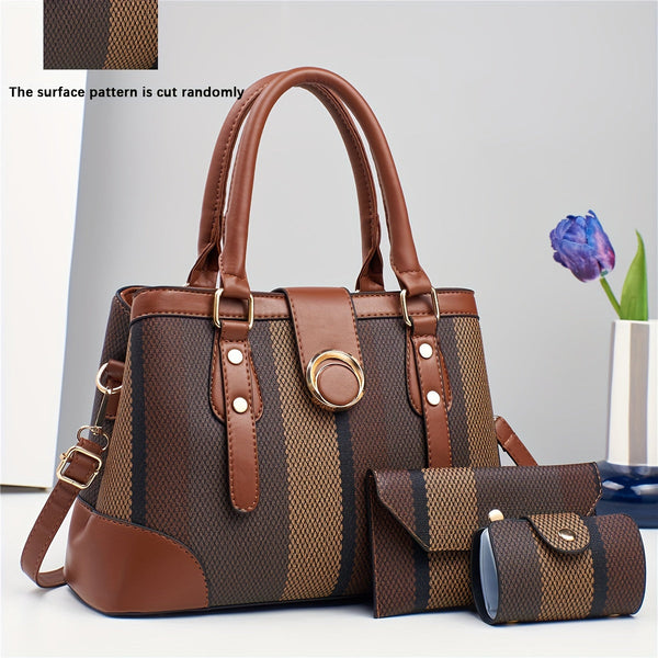 Chic 3pcs Women's Bag Set - Classic Striped, Premium Faux Leather with Detachable Strap, Zip Closure - Versatile & Fashionable in Multiple Colors