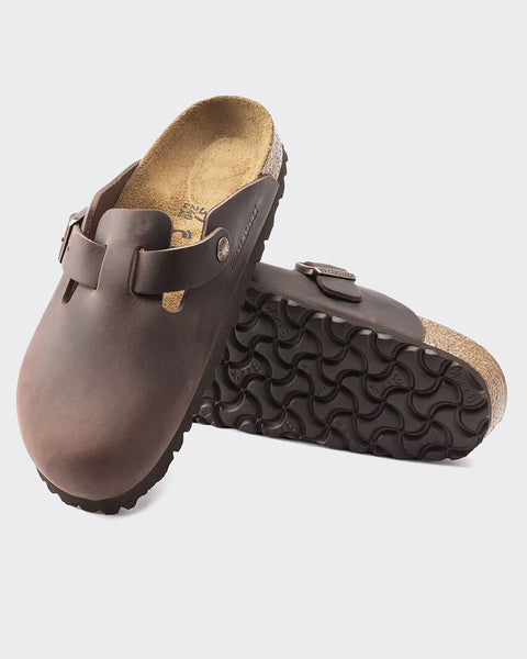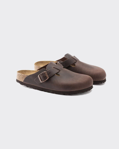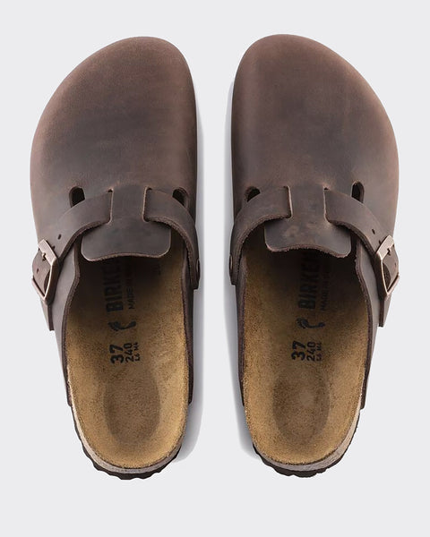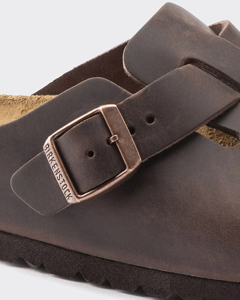 Ciabatta in pelle marrone oliata, fibbia metallica regolabile lateralmente, suola in sughero e gomma.