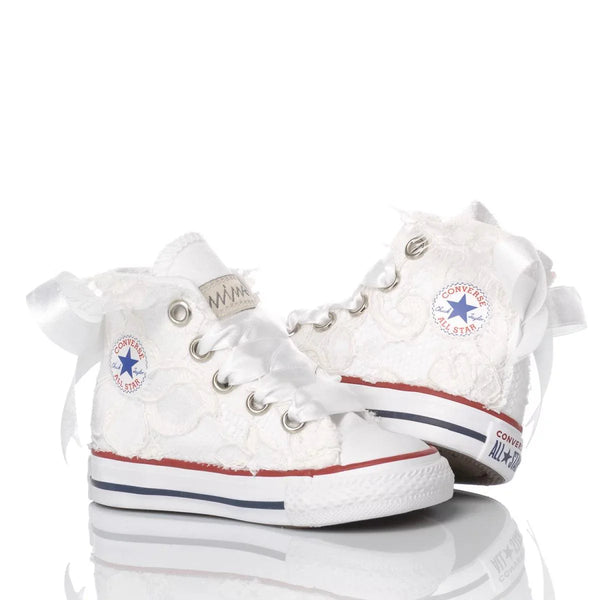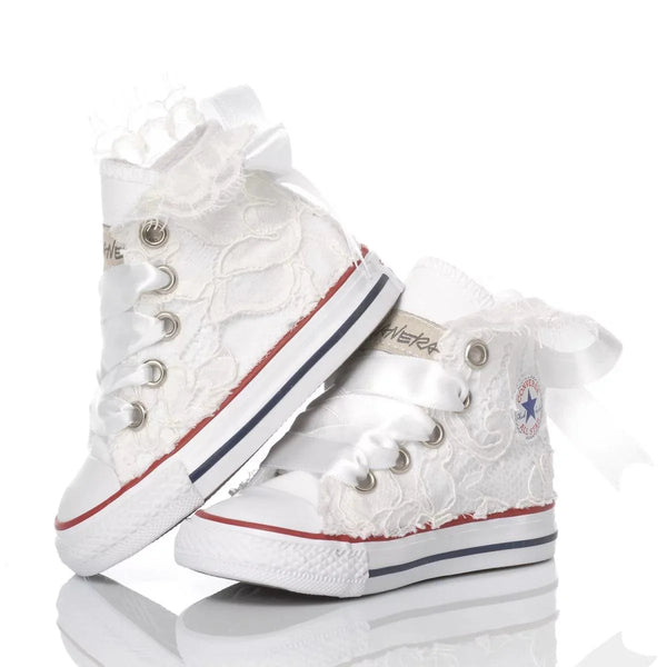 Converse All Star Baby Amabel, una scarpa da sogno sui toni candidi del bianco, ricoperta da un particolare pizzo ricamato con fiocco in raso sul retro, tutto impreziosito da una fila di Swarovski crystal sul retro. Questa scarpina farà sognare mamma e bimba e sarà perfetta anche per accompagnarvi nel tuo giorno speciale, o qualunque sia la vostra meta. La Converse All Star Baby Amabel ti verrà fornita con lacci in raso bianco ed i suoi originali bianchi.