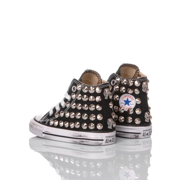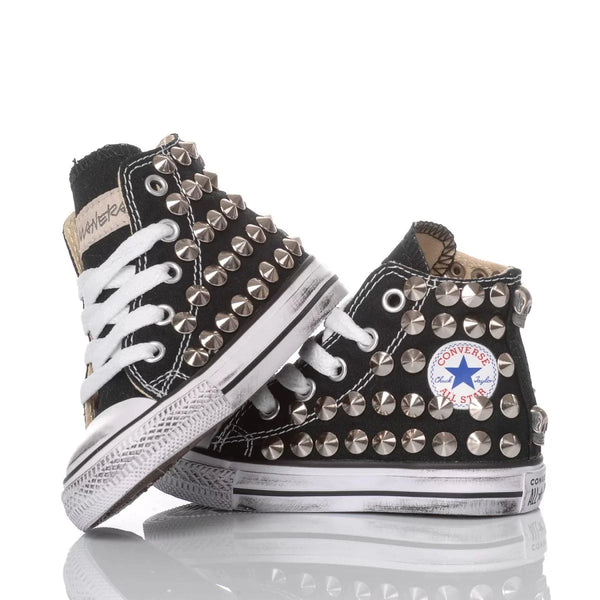 Converse All Star Baby Borchie Nera, un grande classico in casa Mimanera, per chi ci segue da tempo non servono descrizioni, ma rinfreschiamoci comunque la memoria: si tratta appunto della nostra classica sneakers nella versione alta riproposta anche sulla sneakers da bimbo per un perfetto stile matchy-matchy con il tuo piccolo, sulla quale vengono applicate e fissate manualmente e meticolosamente le borchie, sporcata per darle il giusto tono vintage, il risultato è una scarpa dall'animo un po' rock, per dare la giusta sicurezza e grinta ad ogni tuo passo. La Converse All Star Baby Borchie Nera ti verrà fornita con i suoi lacci originali bianchi.