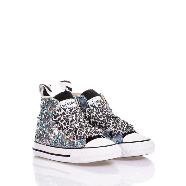 La Converse Baby Denim Spark è la sneakers che farà brillare i piccoli passi! Il denim crocodile embossed dona un tocco di originalità, mentre le micropaillettes nei toni dell'azzurro e dell'argento aggiungono un'effetto scintillante e divertente. Il retro zebrato aggiunge un po' di carattere, mentre i lacci leopardati grigi completano il look con un mix di colori e fantasia che piacerà a tutti. Un perfetto mix di stile e divertimento per i più piccoli, che amano essere sempre alla moda!