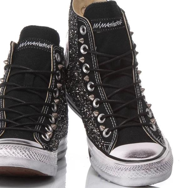 Converse All Star Glitter Black, una sneakers da donna con un look tutto nuovo e particolare. Ricoperta di glitter nero su entrambi i lati e rifinita con borchie tra gli occhielli ed infine una sporcatura vintage per un effetto aged, perchè i tuoi piedi brillino ad ogni passo. La Converse All Star Glitter Black ti verrà fornita con lacci in corda neri oltre ai suoi originali bianchi. Per un maggiore comfort ti proponiamo la nostra solette alzatacco che, oltre alla comodità, ti dona qualche centimetro in più ed uno slancio della figura immediato.