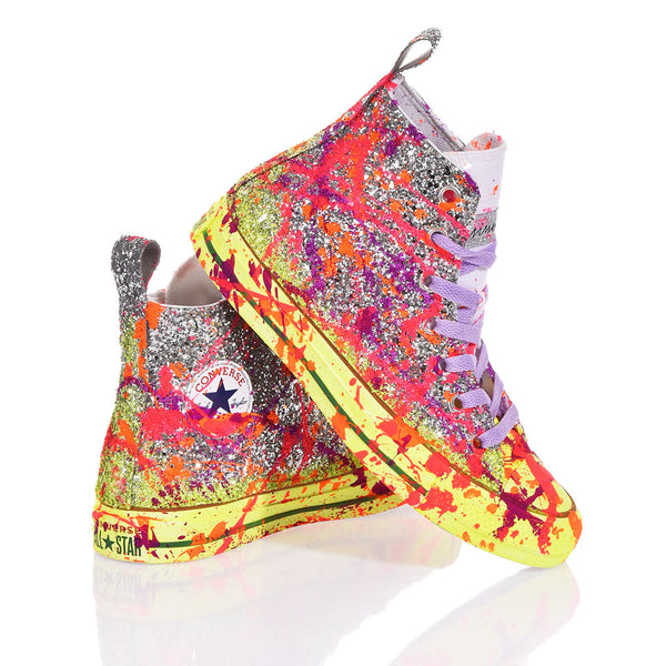 Converse Glitter Drip è la sneakers da donna scintillante e grintosa! Suola giallo fluo e tomaia interamente in glitter argento ricoperti da giocosi schizzi di colore per un look super street ma glamour. Completano questo modello i lacci in cotone lilla.