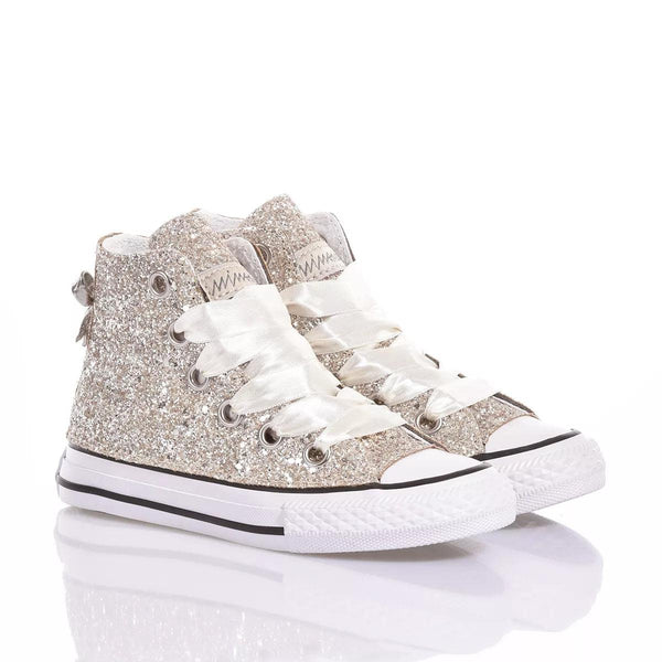 Converse Junior Full Champagne, la vera regina della festa: luccica, brilla ed è colorata la nostra full glitter è esattamente ciò che ti serve, interamente ricoperta di glitter champagne, lati, linguetta e retro: TUTTA. La Converse Junior Full Champagne ti verrà fornita con lacci in raso panna oltre ai suoi originali bianchi. Per un maggiore comfort ti proponiamo la nostra solette alzatacco che, oltre alla comodità, ti dona qualche centimetro in più ed uno slancio della figura immediato.