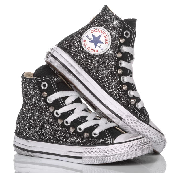 Converse All Star Junior Glitter Black, una sneakers da bambina con un look tutto nuovo e particolare. Ricoperta di glitter oro su entrambi i lati e rifinita con borchie tra gli occhielli, perchè i suoi piedi brillino ad ogni passo. Questo modello è disponibile anche da donna per un perfetto stile matchy-matchy mamma e figlia. La Converse All Star Junior Glitter Black ti verrà fornita con i suoi lacci originali bianchi.
