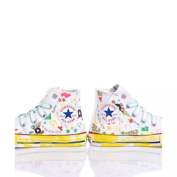 Porta allegria ai piedi dei tuoi piccoli con le sneakers in collaborazione con Silvia& Kids. Converse Junior Playground by Alyssa: design unico e giocoso presenta una fantasia colorata sui lati e una suola con effetto pennellata gialla, in pieno stile Mimanera. I lacci bianchi con profili turchesi aggiungono un tocco vivace.