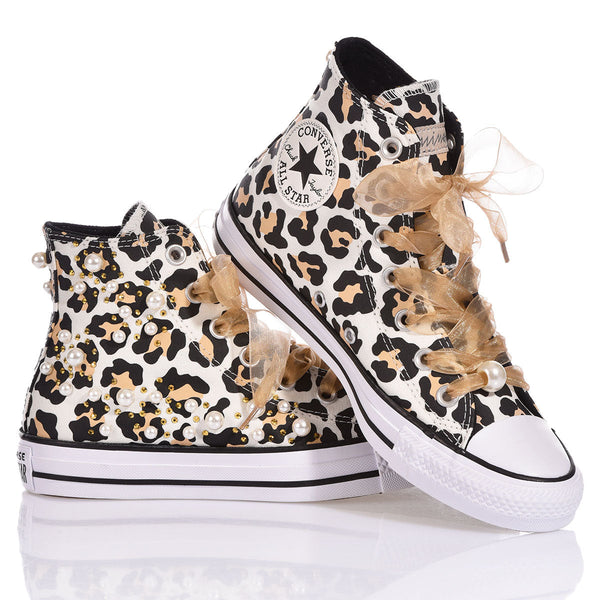 Converse Leo Pearls è la sneaker ideale per elevare ogni look con un mix di grinta e romanticismo. Base leopardata con cascata di perle e swarovski insieme alle graffiature creano un contrasto audace, mentre i lacci in organza si annodano in un fiocco delicato e femminile.