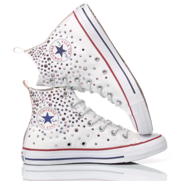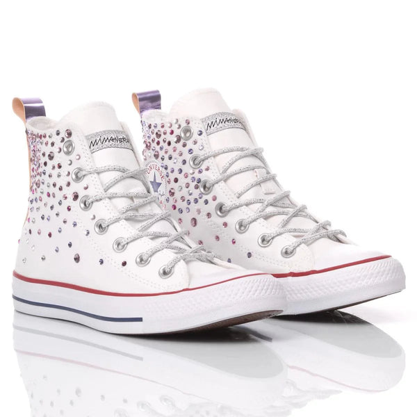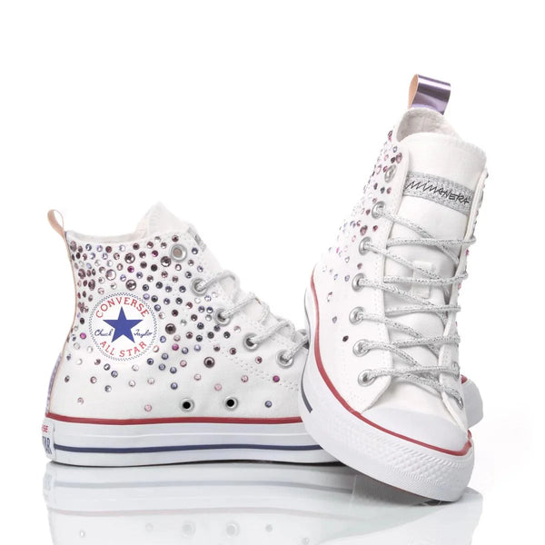 Converse All Star Lily una scarpa unica impreziosita da gemme Swarovski di diversi colori e dimensioni. Per accentuare il carattere fashion, di questa sneakers da donna in versione alta, abbiamo realizzato il retro in laminato viola per riprendere le sfumature di colore delle gemme che la decorano per donare al tuo look uno stile unico. La Chuck Taylor All Star Lily ti verrà fornita con lacci personalizzati in versione argento laminato oltre ai lacci originali bianchi. Per un maggiore comfort ti proponiamo la nostra solette alzatacco che, oltre alla comodità, ti dona qualche centimetro in più ed uno slancio della figura immediato.