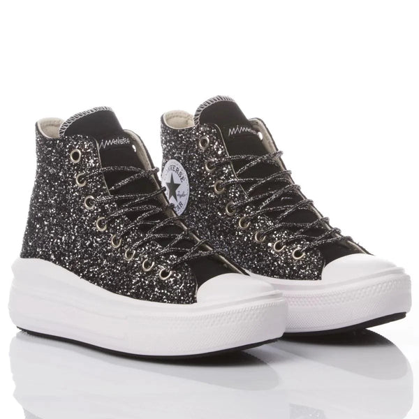Converse All Star Move Glitter Black, una sneakers da donna con un look nuovo e particolare con questa suola sinuosa dalla forma di un onda. Ricoperta di glitter nero su entrambi i lati, perchè i tuoi piedi brillino ad ogni passo. La Converse All Star Move Glitter Black ti verrà fornita con lacci laminati neri oltre ai suoi originali bianchi. Per un maggiore comfort ti proponiamo la nostra solette alzatacco che, oltre alla comodità, ti dona qualche centimetro in più ed uno slancio della figura immediato.