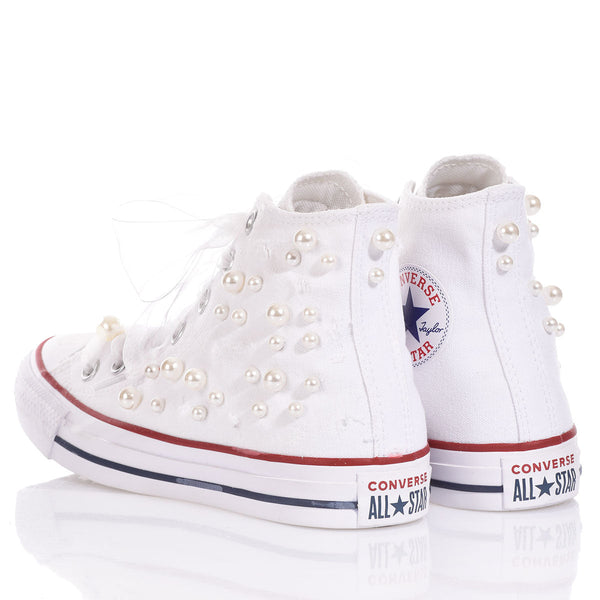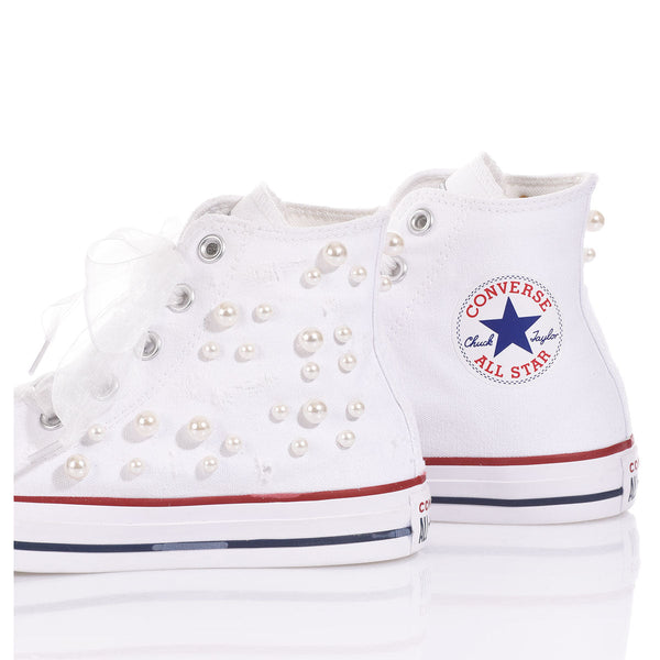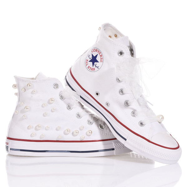 Converse Pearls White è la sneaker ideale per elevare ogni look con un mix di grinta e romanticismo. La cascata di perle e swarovski insieme alle graffiature creano un contrasto audace, mentre i lacci in organza si annodano in un fiocco delicato e femminile.