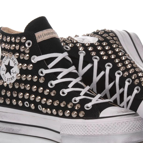 Converse All Star Platform Borchie Nera, un grande classico in casa Mimanera riproposto in modello platform, per chi ci segue da tempo non servono descrizioni, ma rinfreschiamoci comunque la memoria: si tratta appunto della nostra classica sneakers da donna nella versione alta, sulla quale vengono applicate e fissate manualmente e meticolosamente le borchie, sporcata per darle il giusto tono vintage, il risultato è una scarpa dall'animo un po' rock, per dare la giusta sicurezza e grinta ad ogni tuo passo. La Converse All Star Platform Borchie Nera ti verrà fornita con i suoi lacci originali bianchi. Per un maggiore comfort ti proponiamo la nostra solette alzatacco che, oltre alla comodità, ti dona qualche centimetro in più ed uno slancio della figura immediato.