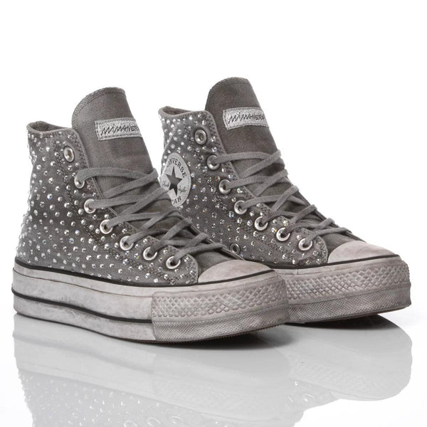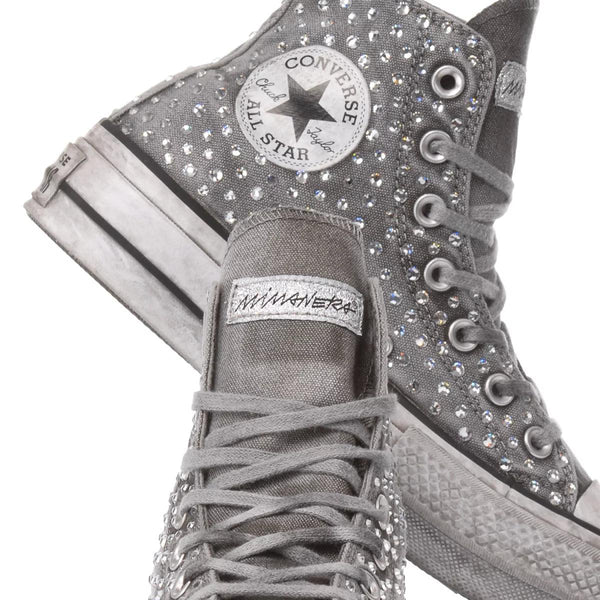 Converse All Star Platform Swarovski Limited, un grande classico in casa Mimanera riproposto in modello platform su una particolare base limited invecchiata: si tratta appunto della nostra classica sneakers da donna nella versione alta, sulla quale vengono applicati manualmente e meticolosamente gli Swarovski uno ad uno, il risultato è una scarpa in grado di donare luce ad ogni tuo passo. La Converse All Star Platform Swarovski Limited ti verrà fornita con i suoi lacci originali grigi. Per un maggiore comfort ti proponiamo la nostra solette alzatacco che, oltre alla comodità, ti dona qualche centimetro in più ed uno slancio della figura immediato.