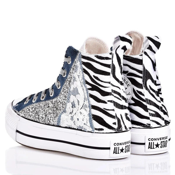 Converse Platform Zebra Lace sono la sneakers custom che ogni donna desidera: un mix perfetto di stile audace e dettagli sofisticati. Il patchwork di denim chiaro e scuro si unisce a un accattivante motivo animalier zebra, arricchito da glitter argento e pizzo, creando un design unico che cattura l'attenzione. I lacci piatti light silver completano il tutto con un tocco brillante e moderno.