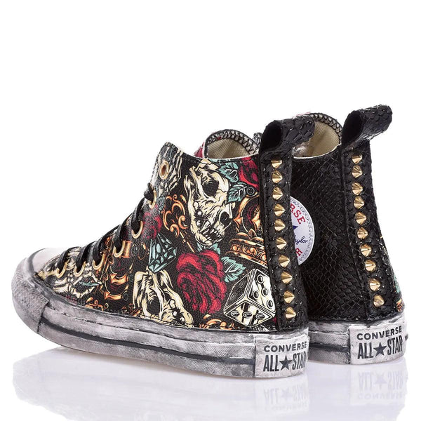 Converse Red Skull è la sneakers che unisce grinta e stile. Il lato con stampa skull & roses crea un contrasto intrigante e potente, mentre l'altro lato in ecopelle pitonata nera conferisce un tocco pregiato e misterioso. Il retro, impreziosito da una fila di borchie dorate, aggiunge un accento rock e sofisticato. La linguetta in ecopelle pitonata rossa e il laccio cerato piatto nero completano il look con un mix di audacia e glam. Perfette per chi cerca una sneakers che esprima personalità, forza e un tocco di stile unici.