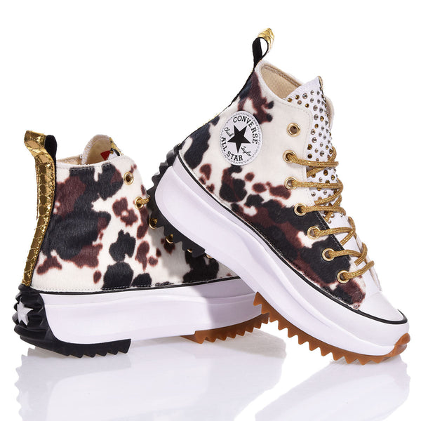 Converse Run Star Hike Cow è un mix audace di stile e personalità. Tomaia rivestita in fantasia animalier, impreziosita da una linguetta con cascata di cristalli Swarovski per un tocco di luce sorprendente. Il retro in ecopelle pitonata oro e i lacci in lurex completano il design con una nota glamour e grintosa.