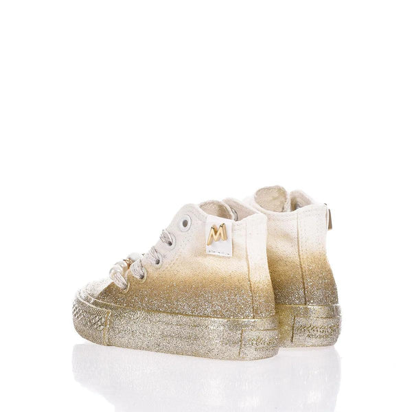 Ispirate al classico modello Converse , il dettaglio che le rende veramente uniche è la spruzzata di glitter oro che crea un effetto sfumato dalla suola alla caviglia, lasciando intravedere il fondo in cotone bianco della scarpa. I lacci bianchi con trama lurex oro sono resi ancora più particolari dagli accessori rimovibili sul fondo dell’allacciatura.