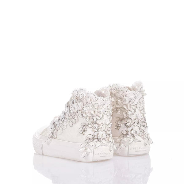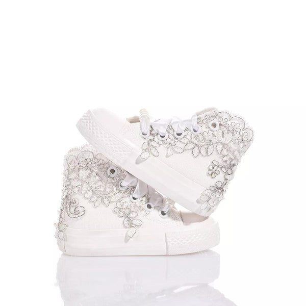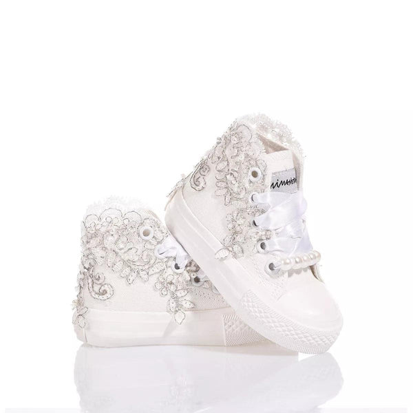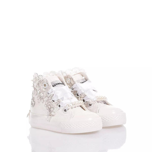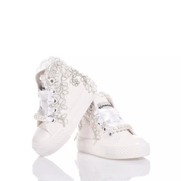 Mimanera Airlines Baby Lucy è la sneakers delicata e elegante per i più piccoli! Ispirate all’iconico modello Converse con suola completamente bianca e design esclusivo: ricamo smerlato bianco e argento con paillettes, perle e perline lungo tutta la caviglia che riveste dolcemente i lati della sneakers. Completano il look i lacci in raso bianco con perle rimovibili sul fondo dell’allacciatura.
