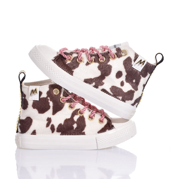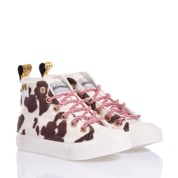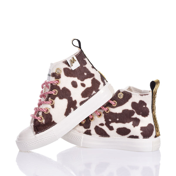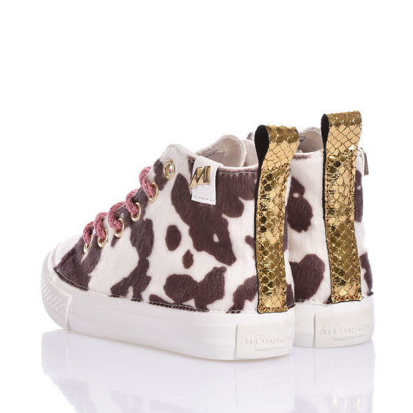 Mimanera Airlines Junior Cow è la sneaker ideale per giovani spiriti creativi che vogliono esprimere il proprio stile con grinta. Ispirata al classico modello Converse, si distingue per la tomaia in tessuto effetto cavallino con stampa mucca, dal carattere wild ma sempre cool. Il retro in ecopelle pitonata oro aggiunge un tocco brillante e di tendenza, mentre i lacci torchon rosa intrecciati con lurex danno un accento originale e luminoso.
