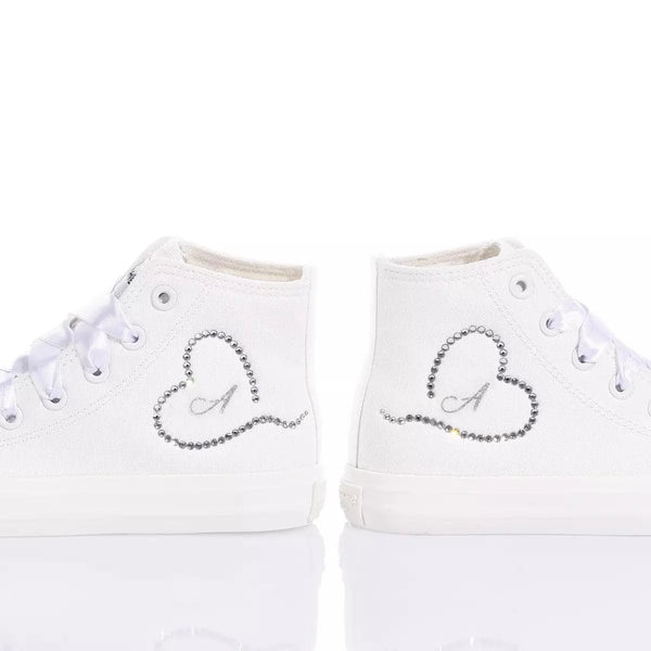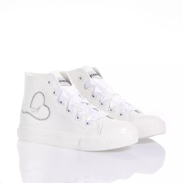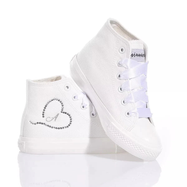Mimanera Airlines Junior Heart è un piccolo gioiello ispirato al classico modello Converse ma offrendo una suola completamente bianca per renderla ancora più delicata ed elegante. Un cuore di Swarovski fa da cornice all’iniziale del nome della tua bambina in glitter argento, un modo sofisticato di personalizzare la sneakers anche per i più piccoli. I delicati lacci in raso bianco completano il look della Mimanera Airlines Junior Heart.