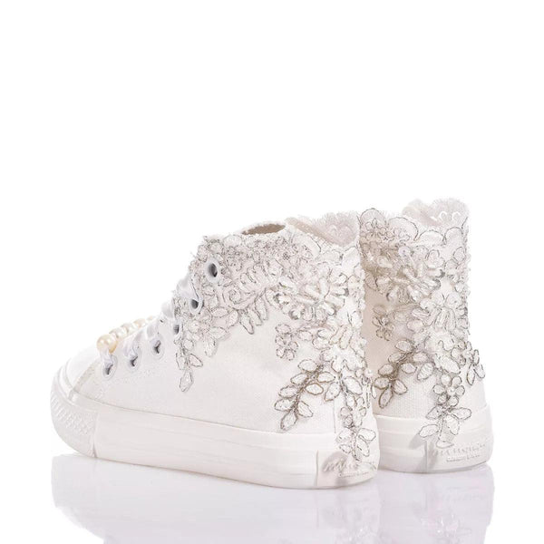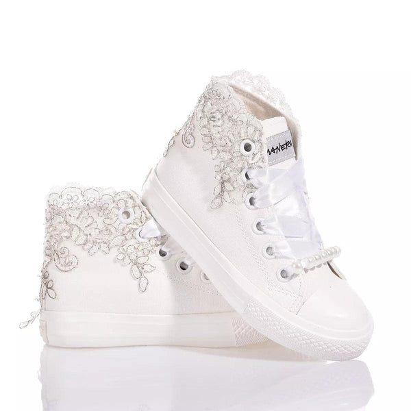 Mimanera Airlines Junior Lucy è la sneakers delicata e elegante per i più piccoli! Ispirate all’iconico modello Converse con suola completamente bianca e design esclusivo: ricamo smerlato bianco e argento con paillettes, perle e perline lungo tutta la caviglia che riveste dolcemente i lati della sneakers. Completano il look i lacci in raso bianco con perle rimovibili sul fondo dell’allacciatura.