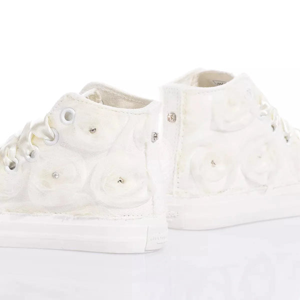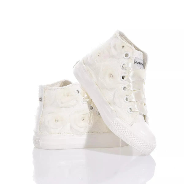 Mimanera Airlines Junior Rosy sono le sneakers custom super delicate e raffinate. Rivestite da piccole rose di tulle panna, ogni bocciolo nasconde uno Swarovski che aggiunge un tocco di luce ad ogni passo. I lacci panna completano il look elegante di questa sneakers.