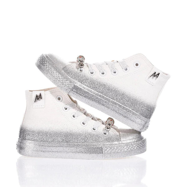 Ispirate al classico modello Converse, il dettaglio che le rende veramente uniche è la spruzzata di glitter argento che crea un effetto sfumato dalla suola alla caviglia, lasciando intravedere il fondo in cotone bianco della scarpa. I lacci bianchi con trama lurex argento sono resi ancora più particolari dagli accessori rimovibili sul fondo dell’allacciatura.