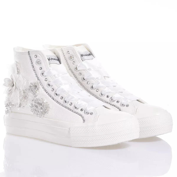 Mimanera Airlines Platform Bella: un sogno diventato realtà per ogni donna che cerca l'eleganza senza tempo. Ispirate al modello Converse, queste sneakers offrono una suola platform completamente bianca per un'inconfondibile sensazione di slancio e comfort ad ogni passo. ricoperta da un prezioso pizzo ricamato con paillettes e perline, impreziosito da fiori in tulle e organza che si fondono armoniosamente con il castone. La sneakers è arricchita da una fila di cristalli Swarovski lungo il passalacci, aggiungendo un tocco di luce ed eleganza.