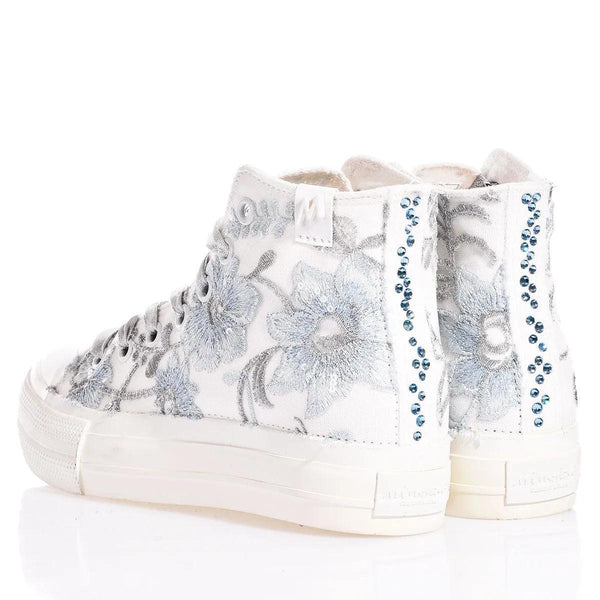 Gli occhielli bianchi e i lacci argento in delicato contrasto con la scia di swarovski sul retro, conferendo un ulteriore tocco di eleganza e rendendo queste sneakers perfette per chi desidera rivivere l'atmosfera della corte francese con un twist moderno.