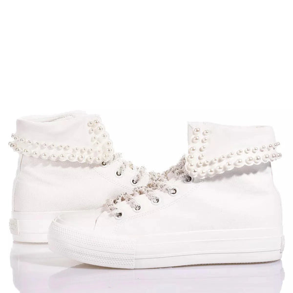 Raffinato bordo smerlato alla caviglia con profilo interamente ricoperto da doppia fila di perle, abbinate al punto forte di questo modello, ovvero i preziosi lacci ricamati con perle e perline. Un tripudio di eleganza ideale per distinguersi ad ogni passo.